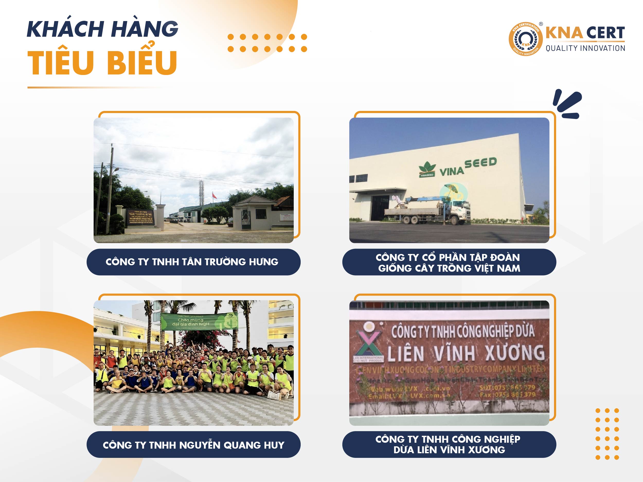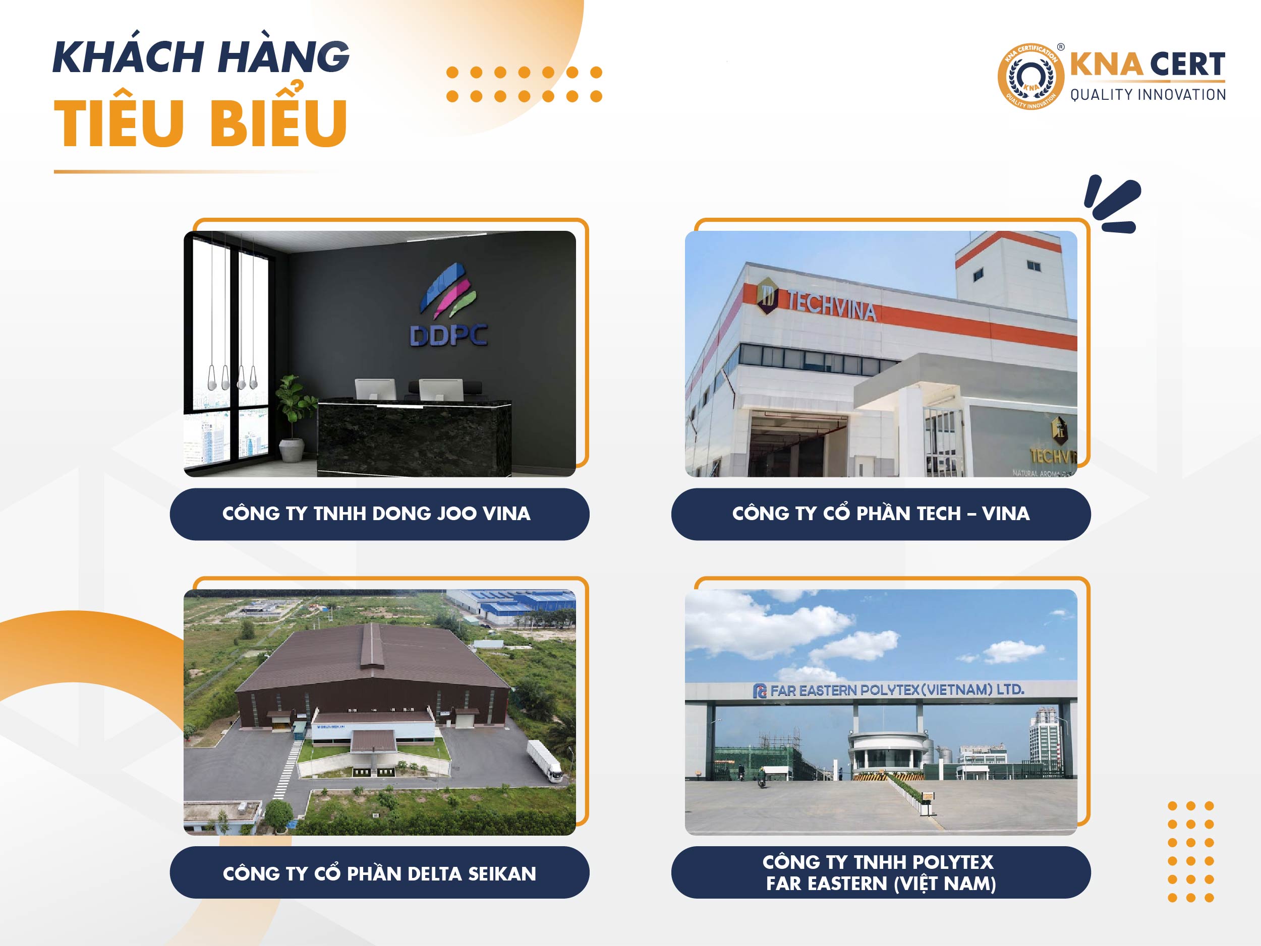 KNA CERT đã hỗ trợ cấp hàng nghìn chứng chỉ FSSC 22000 cho các doanh nghiệp hoạt động trong nhiều lĩnh vực, ngành nghề khác nhau. Dưới đây là một số Khách Hàng đã sử dụng dịch vụ của Chúng Tôi: