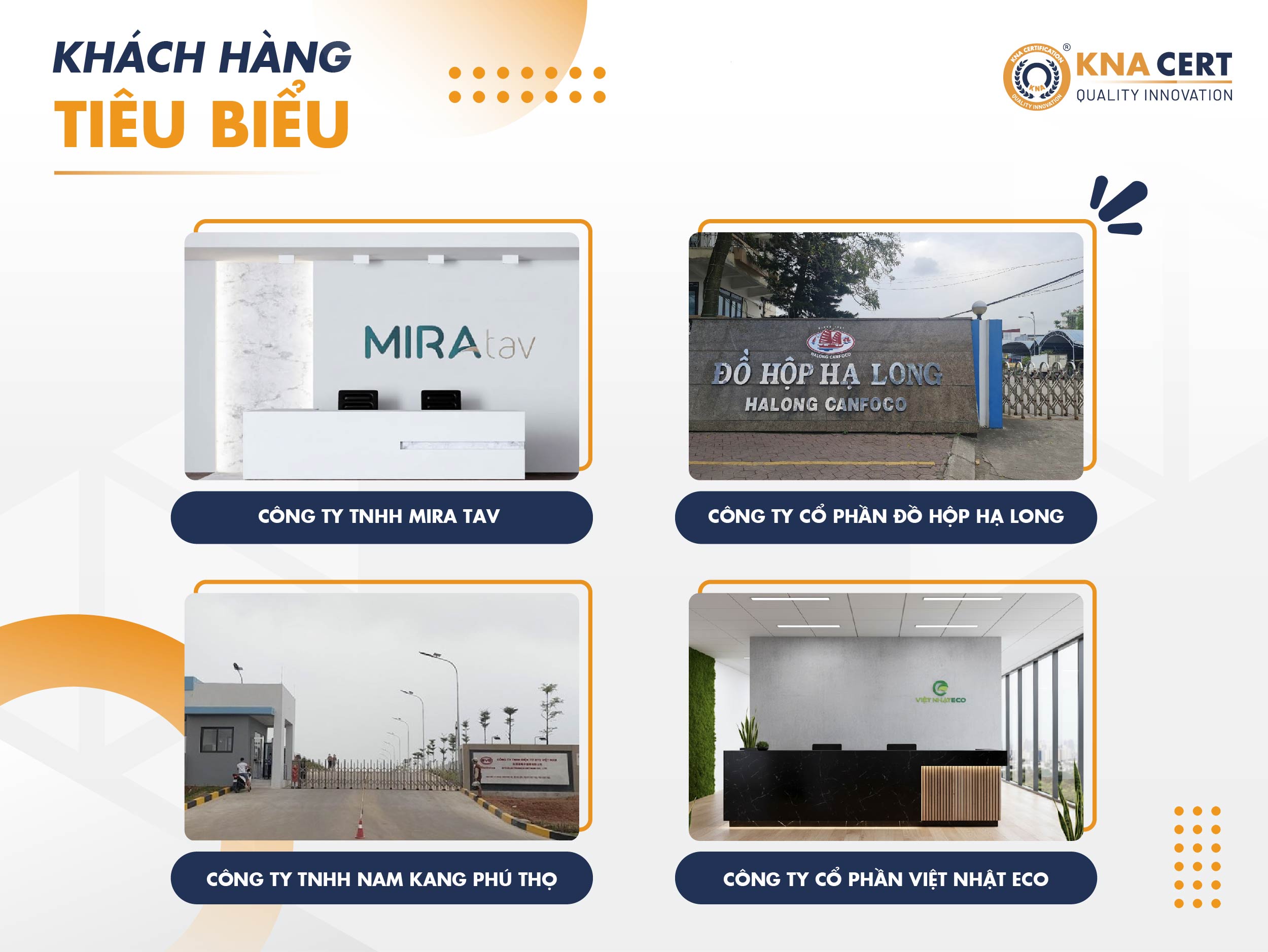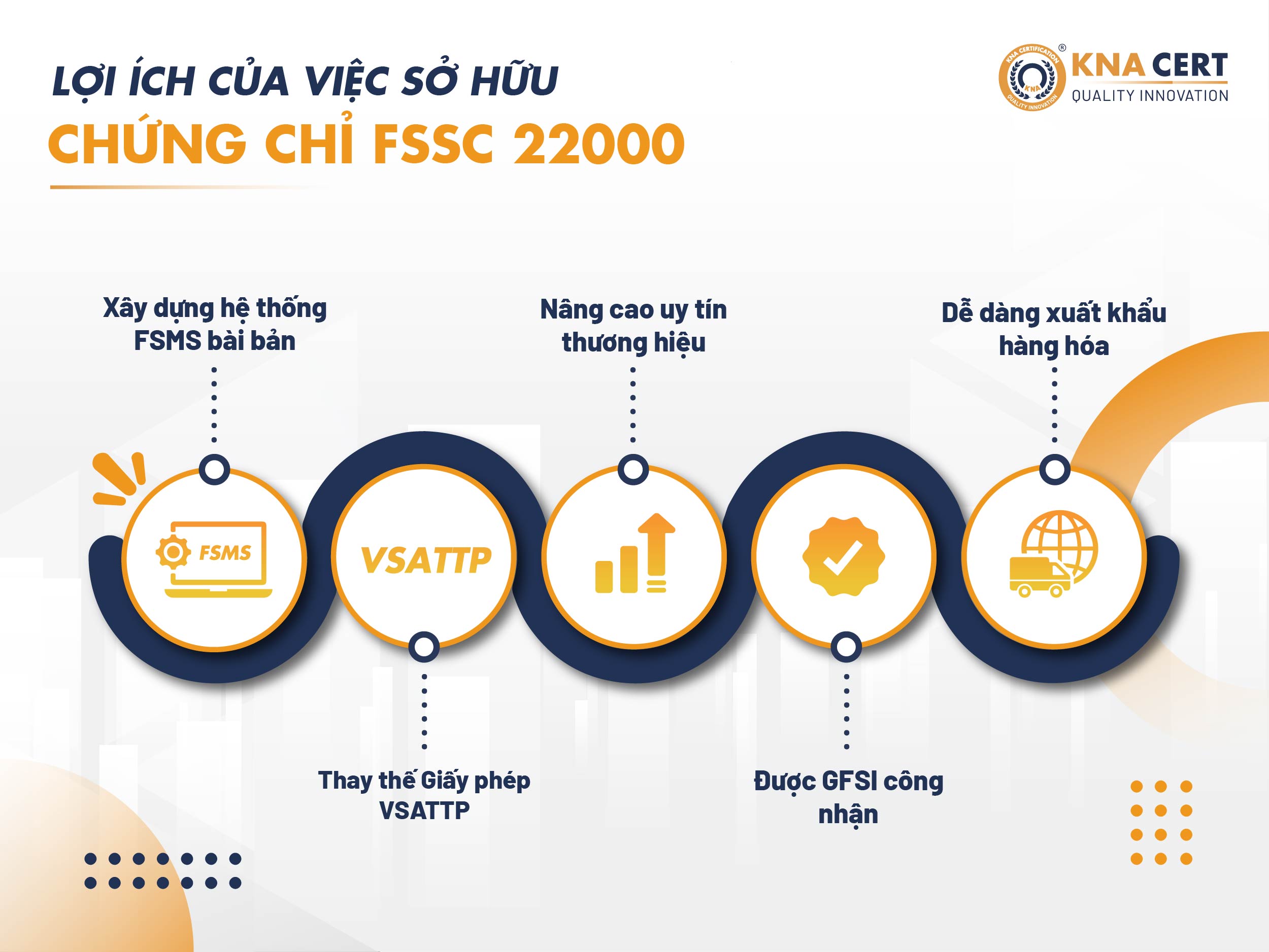 Với tư cách là một trong những tổ chức chứng nhận hàng đầu tại Việt Nam, cùng phương châm: “Cùng Doanh Nghiệp vươn tầm Quốc Tế - Nâng vị thế Thương Hiệu Quốc Gia”, KNA tự hào đã giúp hàng nghìn doanh nghiệp sở hữu các chứng chỉ hợp lệ, trong đó có chứng nhận FSSC 22000.
