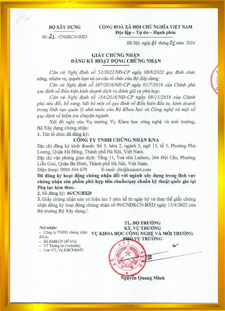 KNA CERT được Bộ Xây dựng cấp giấy chứng nhận đăng ký hoạt động chứng nhận hợp quy theo quy định của pháp luật Việt Nam cho 300 sản phẩm vật liệu xây dựng.