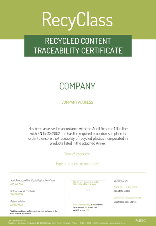 Để đủ điều kiện nhận được chứng nhận, (các) nhà tái chế phải được chứng nhận Quy trình Tái chế RecyClass hoặc bất kỳ chứng nhận tương đương nào khác phù hợp với EN 15343 và sản phẩm của bạn phải được làm bằng nhựa.
