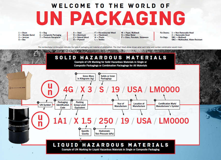 Ví dụ: Mã UN 1A2 / Y2.0 / 100 / 12 / USA / M4460 cho biết đây là thùng thép có đầu hở, được Liên Hợp Quốc chứng nhận. Nó có thể chứa chất lỏng nguy hiểm ở mức độ trung bình đến thấp một cách an toàn với trọng lượng riêng không lớn hơn 2,0 và chịu được áp suất lên tới 100 kilopascal trong quá trình vận chuyển và bảo quản. Cuối cùng, loại thùng do Mỹ sản xuất được Cleveland Steel Container sản xuất vào năm 2012.