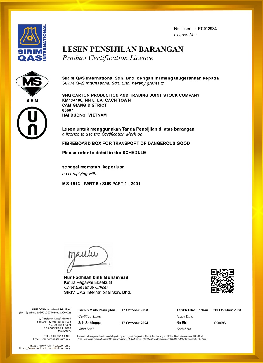 SIRIM QAS International Sdn. Bhd. được thành lập vào tháng 03/1997 là cơ quan thử nghiệm, kiểm tra và chứng nhận hàng đầu của Malaysia, đồng thời là đối tác của Mạng lưới Chứng nhận Quốc tế (IQNet). SIRIM QAS cung cấp đa dạng các dịch vụ thử nghiệm và chứng nhận khác nhau, trong đó có dịch vụ chứng nhận UN Mark dành cho bao bì đóng gói hàng hóa nguy hiểm.