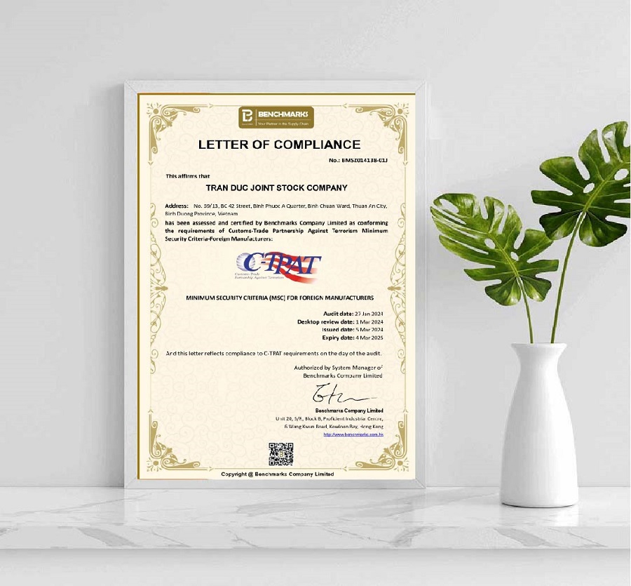 Tóm lại, việc sở hữu chứng chỉ C-TPAT không chỉ giúp Công ty Cổ phần Trần Đức đảm bảo an ninh chuỗi cung ứng mà còn mở ra cơ hội mới trong thương mại Quốc tế. Đây là một bước tiến lớn cho Công Ty và là mang lại những lợi ích không thể phủ nhận trong hành trình phát triển và mở rộng thị trường của Trần Đức.