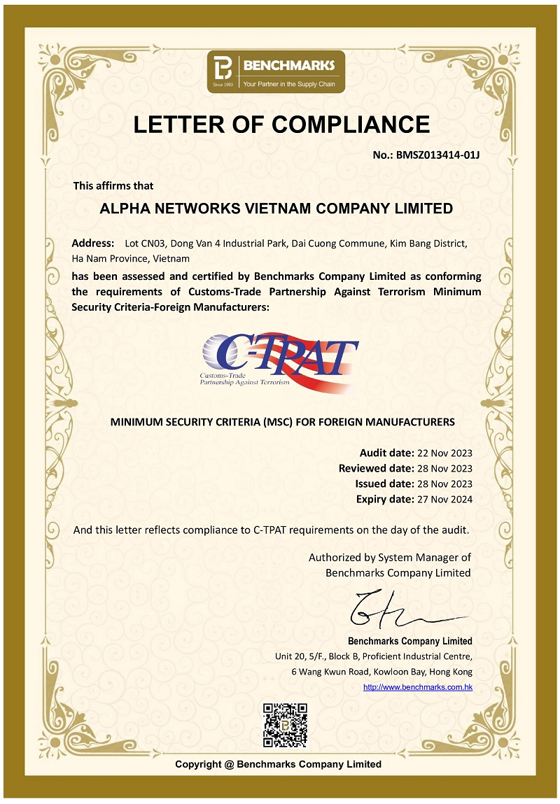 Chứng thư C-TPAT của Công Ty TNHH Alpha Networks Việt Nam