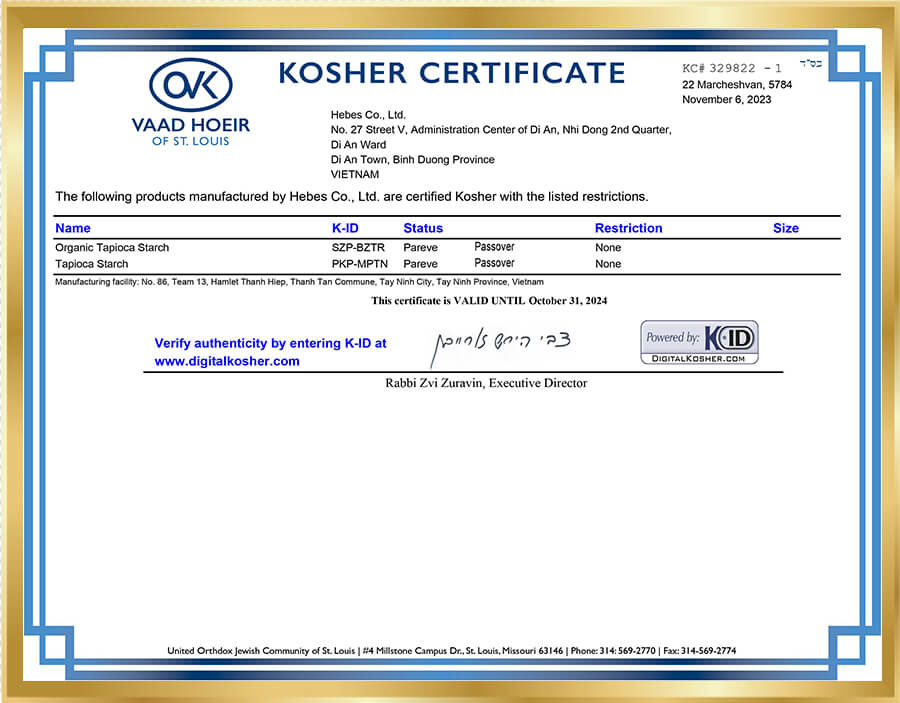 Công ty TNHH Hebes là doanh nghiệp chuyên sản xuất tinh bột sắn. Để thúc đẩy hoạt động sản xuất và kinh doanh, Công Ty đã áp dụng tiêu chuẩn Kosher (Tiêu chuẩn thực phẩm của người Do Thái).