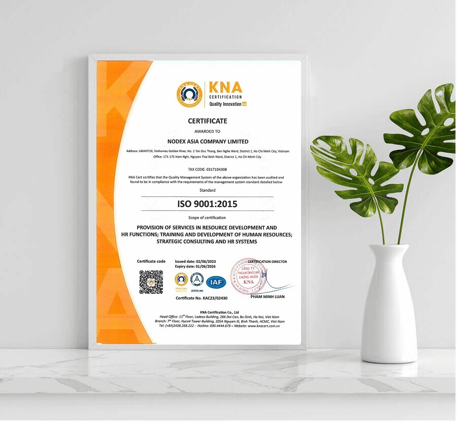 Tâm huyết trong việc mang đến giải pháp nhân sự và đào tạo nhân lực hiệu quả cho doanh nghiệp, NodeX đã đưa ra một quyết định quan trọng trong việc nâng cao chất lượng dịch vụ, đó là áp dụng Hệ thống quản lý chất lượng ISO 9001. ISO 9001:2015 là tiêu chuẩn quốc tế về quản lý chất lượng, đánh giá và công nhận các hệ thống quản lý chất lượng tối ưu trong doanh nghiệp.