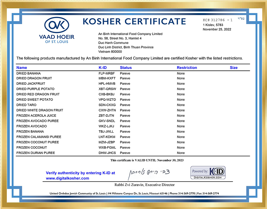 Công ty TNHH Thực phẩm Quốc tế An Bình sở hữu chứng chỉ Kosher