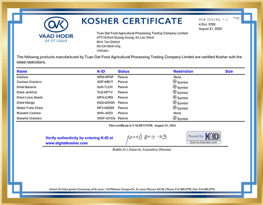 Tuấn Đạt đã lựa chọn KNA CERT là đơn vị đánh giá Kosher (Pre-audit) cho Công Ty. KNA hiện là đối tác chính thức của Tổ chức Vaad Hoeir of St. Louis (OVK) - một trong những tổ chức chứng nhận Kosher đáng tin cậy và được công nhận hàng đầu trên Thế giới hiện nay.