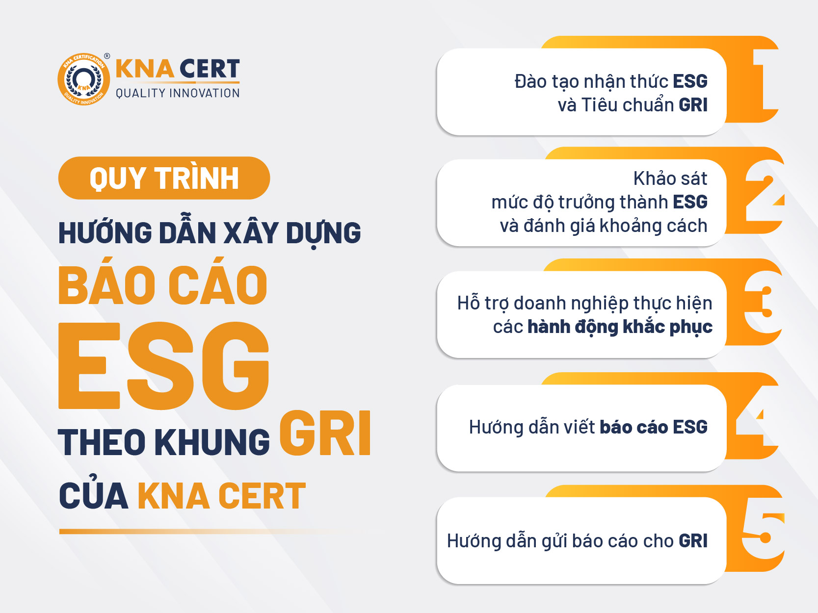 Dựa trên am hiểu sâu về tiêu chuẩn GRI và kinh nghiệm đồng hành cùng nhiều doanh nghiệp, KNA CERT triển khai quy trình hướng dẫn xây dựng báo cáo ESG (theo khung GRI) với 5 bước: