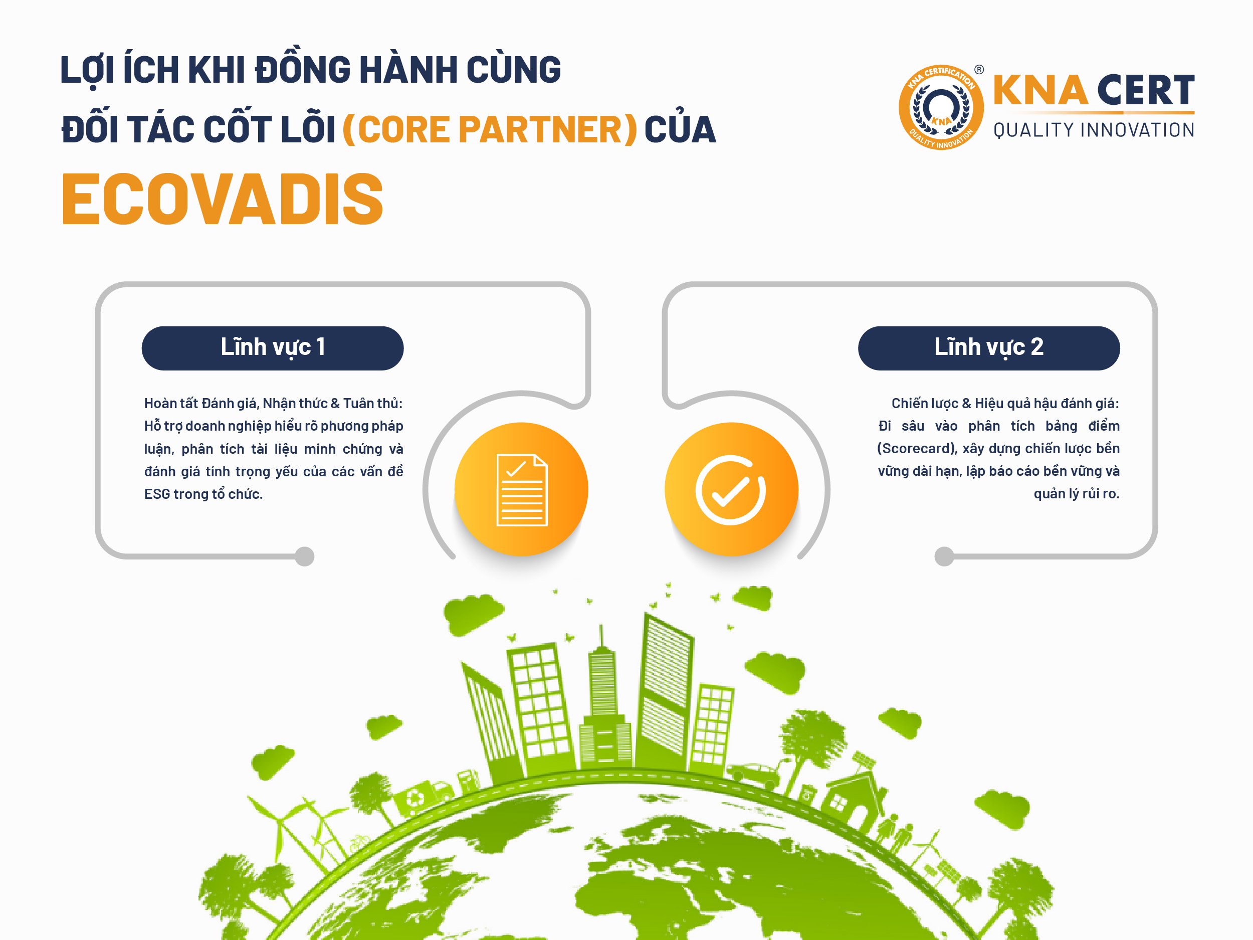 KNA CERT hiện là Đối tác Cốt lõi (Core Partner) của EcoVadis. Đáng chú ý, chúng tôi hiện là một trong bảy tổ chức được công nhận tại khu vực Châu Á - Thái Bình Dương & Nhật Bản. Điều này không chỉ minh chứng cho năng lực chuyên môn của KNA CERT mà còn là lời khẳng định về uy tín hàng đầu của chúng tôi trong lĩnh vực tư vấn phát triển bền vững.