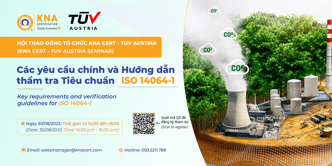 Để giúp các doanh nghiệp có cái nhìn rõ ràng hơn về Hệ thống kiểm kê Khí nhà kính (GHG), đồng thời giải đáp các thắc mắc xoay quanh việc áp dụng và chứng nhận tiêu chuẩn ISO 14064, ngày 30/08/2023, KNA CERT tổ chức Hội thảo "Các yêu cầu chính và Hướng dẫn thẩm tra Tiêu chuẩn ISO 14064-1". Đặc biệt, Hội thảo có sự tham gia của các chuyên gia thuộc Tổ chức TUV Austria hứa hẹn sẽ là một buổi trao đổi, chia sẻ kinh nghiệm hữu ích và chuyên sâu.