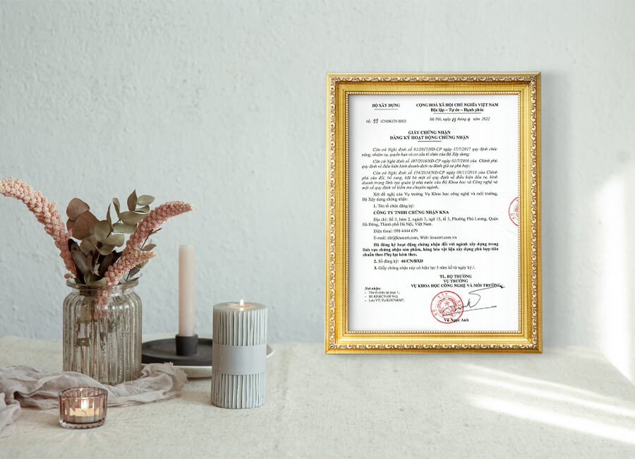 KNA CERT được Bộ Xây dựng cấp giấy chứng nhận đăng ký hoạt động chứng nhận hợp chuẩn theo quy định của pháp luật Việt Nam cho 185 sản phẩm vật liệu xây dựng, trong đó có Cửa sổ, Cửa đi.