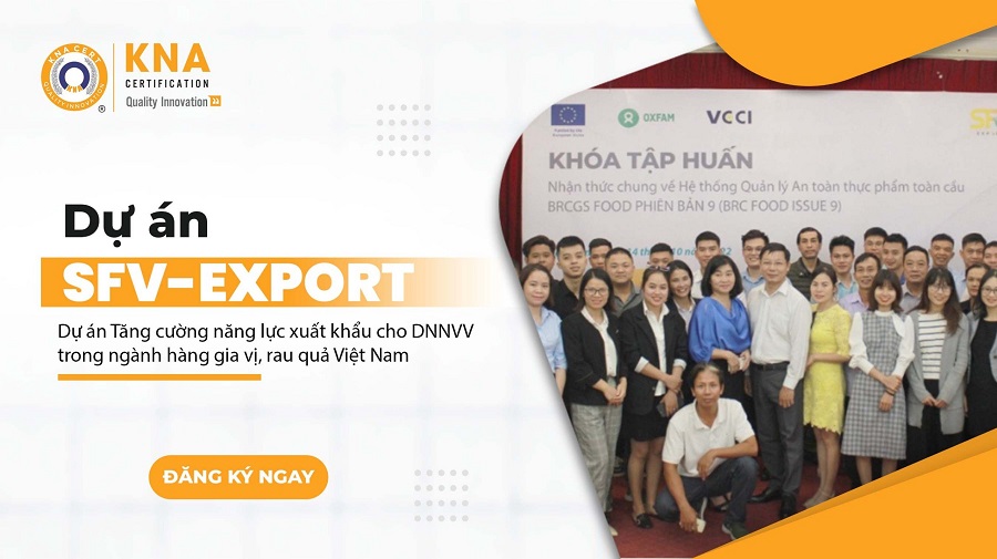 Dự án “Tăng cường năng lực xuất khẩu cho DNNVV trong ngành hàng gia vị, rau quả Việt Nam” (SFV-Export) do EU tài trợ, được phối hợp thực hiện bởi tổ chức Oxfam tại Việt Nam cùng VCCI. Với tư cách là đối tác kỹ thuật của dự án SFV-Export, KNA CERT vinh dự phối hợp tổ chức nhiều khóa đào tạo tiêu chuẩn hữu ích dành cho doanh nghiệp.