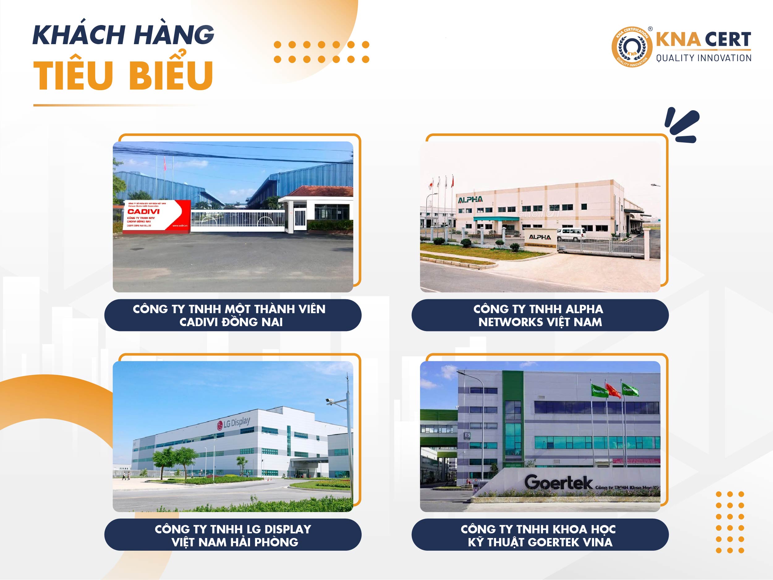 KNA CERT đã hỗ trợ cấp nhiều Tuyên bố thẩm tra ISO 14064-1 cho các doanh nghiệp hoạt động trong nhiều lĩnh vực, ngành nghề khác nhau. Dưới đây là một số Khách Hàng đã sử dụng dịch vụ của Chúng Tôi:
