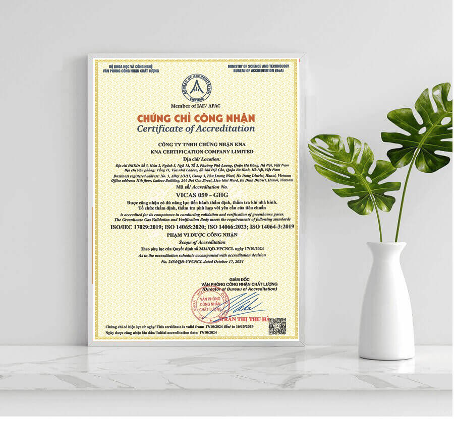 KNA CERT được Tổng cục Tiêu chuẩn Đo lường Chất lượng thuộc Bộ Khoa học và Công nghệ công nhận là tổ chức thẩm định, thẩm tra có hệ thống thẩm định, thẩm tra khí nhà kính phù hợp theo yêu cầu của tiêu chuẩn ISO/IEC 17029:2019, ISO 14065:2020, ISO 14066:2023 và ISO 14064-3:2019.