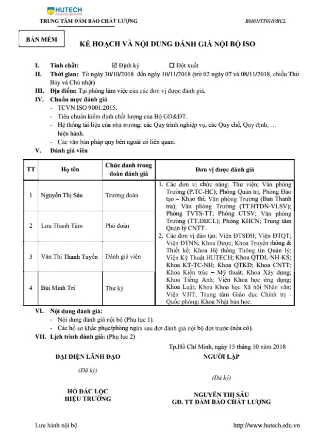 Dưới đây là một ví dụ về mẫu kế hoạch đánh giá nội bộ mà doanh nghiệp có thể tham khảo: