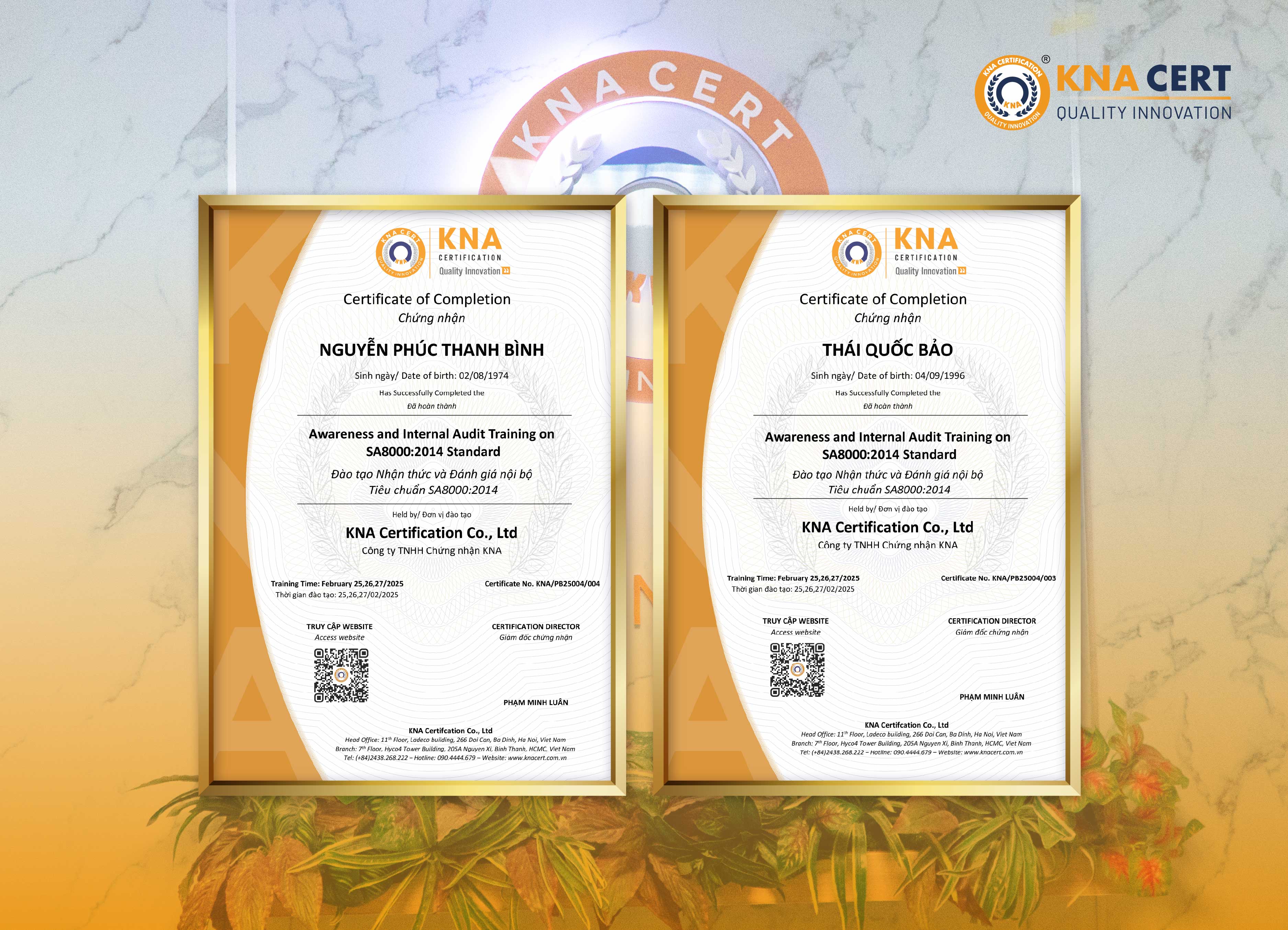 Với hơn 10 năm kinh nghiệm trong lĩnh vực đào tạo, KNA CERT tự hào là ĐỐI TÁC TIN CẬY hàng đầu tại Việt Nam trong việc cung cấp các khóa học về trách nhiệm xã hội, đặc biệt là SA8000.