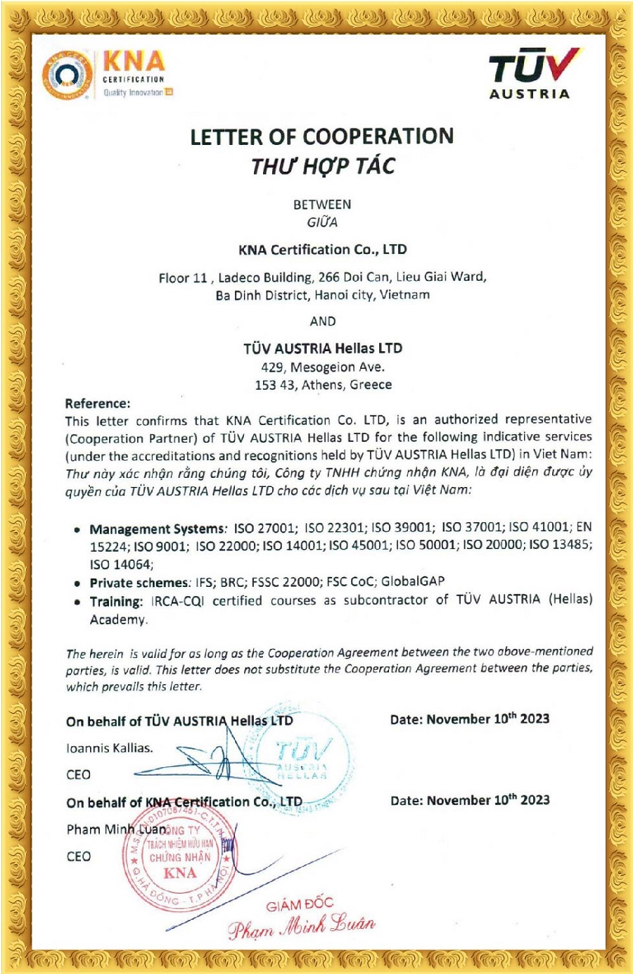 KNA CERT đã hợp tác với TUV AUSTRIA trong việc cung cấp dịch vụ đánh giá chứng nhận ISO 9001, ISO 14001, ISO 45001, ISO 27001, ISO 21001 và ISO 29993, OK Compost ...tại Việt Nam. Theo đó, TUV Austria ủy quyền cho KNA CERT là đơn vị hợp tác cung cấp dịch vụ Chứng nhận các tiêu chuẩn Quốc tế trên tại Việt Nam.