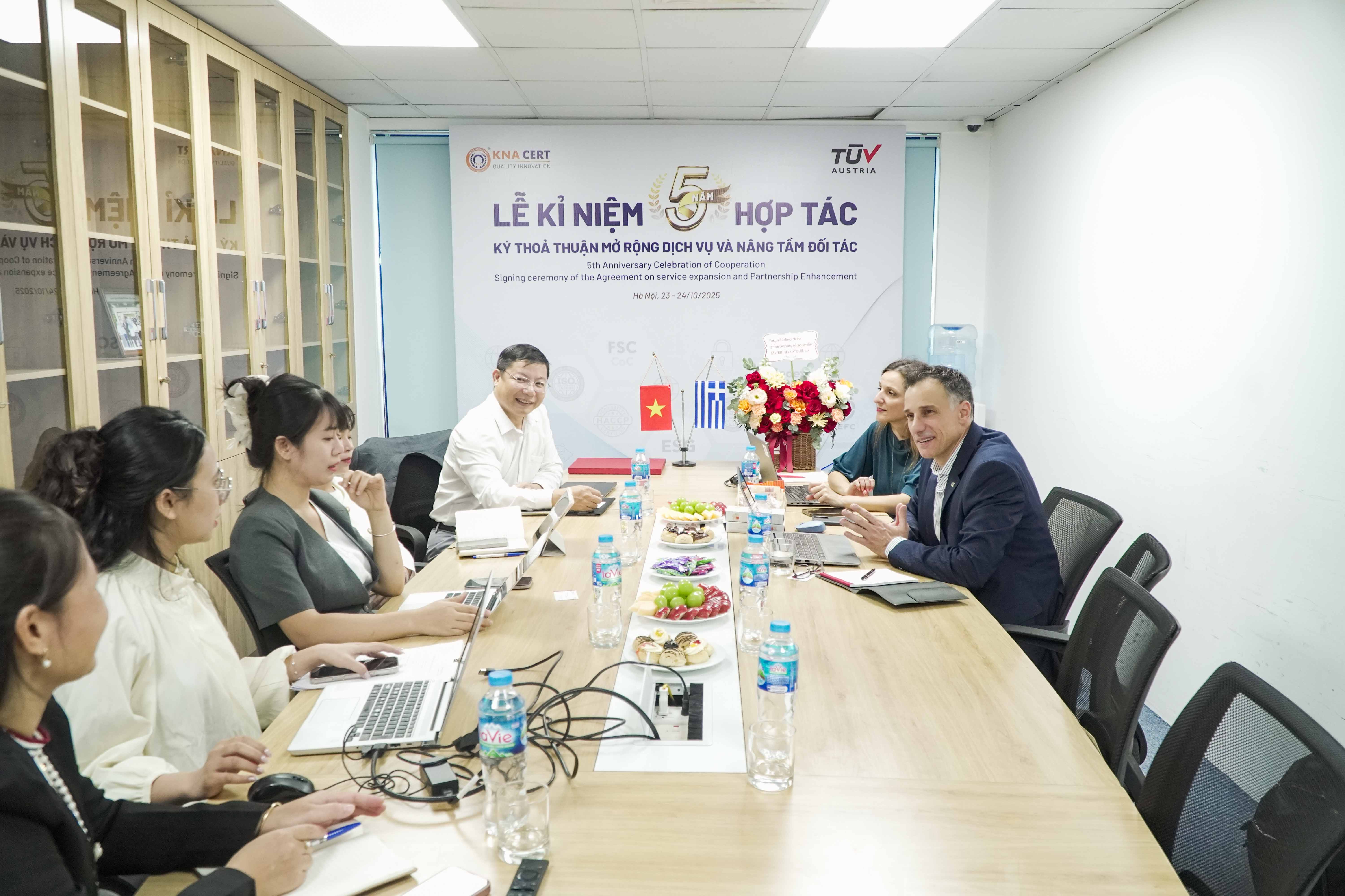 Trong hai ngày làm việc chính thức (23-24/10/2025), KNA CERT và TÜV AUSTRIA Hellas đã phối hợp tổ chức chương trình làm việc và đánh giá nội bộ chuyên sâu về tiêu chuẩn FSC cùng các tiêu chuẩn hệ thống quản lý ISO. Đây là cơ hội để hai bên cùng nhìn lại những thành quả đã đạt được, đồng thời trao đổi và định hướng phát triển các dịch vụ mới nhằm đáp ứng nhu cầu ngày càng cao của thị trường.