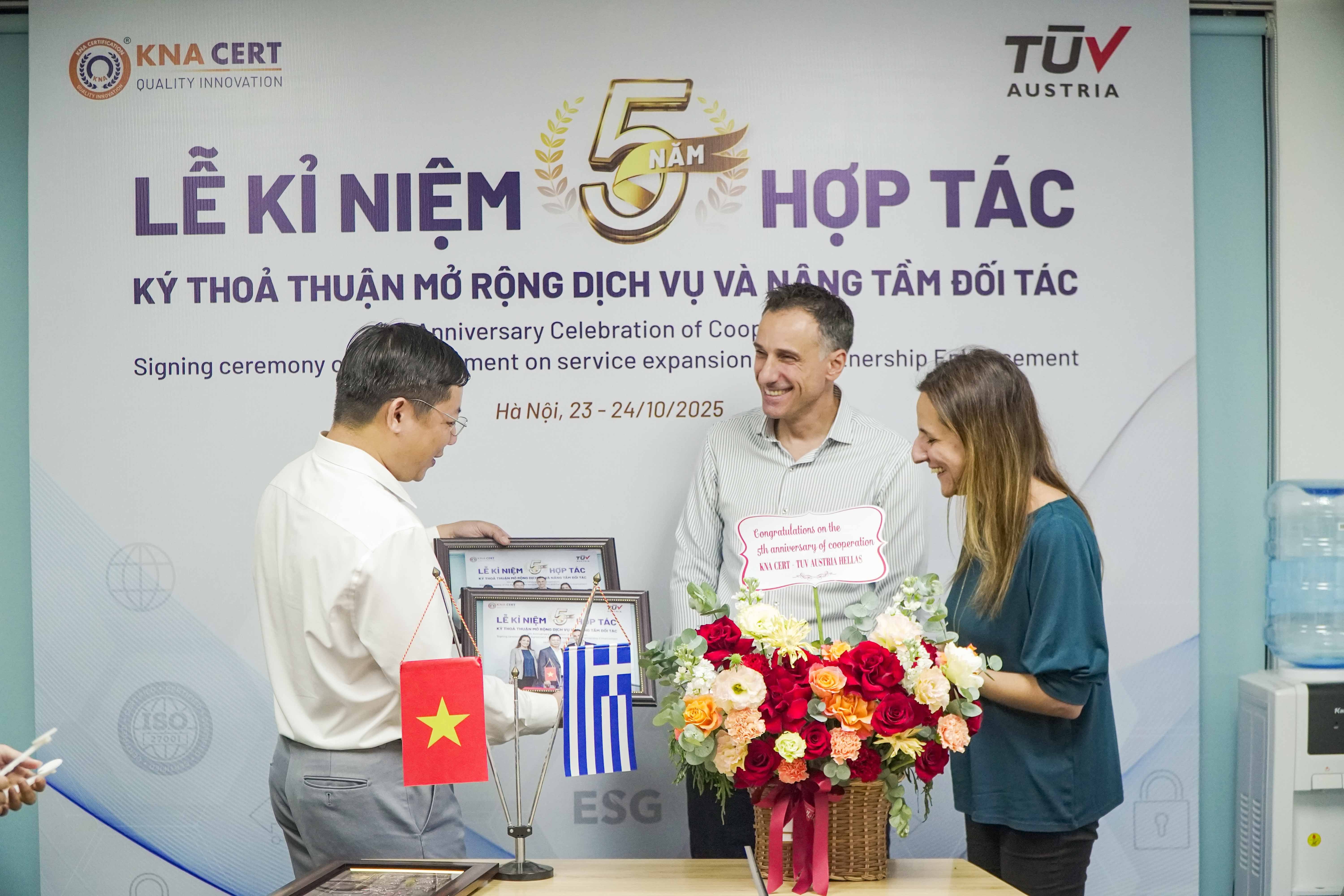 Từ ngày 23 đến 26 tháng 10 năm 2025, tại văn phòng KNA CERT ở Hà Nội đã diễn ra sự kiện quan trọng: Lễ kỷ niệm 5 năm hợp tác và ký kết Biên bản ghi nhớ mở rộng (MOU) giữa KNA CERT và TÜV AUSTRIA. Sự kiện này không chỉ đánh dấu chặng đường 5 năm gắn bó bền chặt mà còn mở ra những cơ hội phát triển mới, khẳng định vị thế của hai tổ chức trong việc cung cấp các dịch vụ đào tạo và đánh giá chứng nhận đạt chuẩn quốc tế.