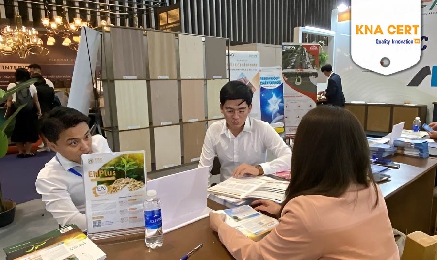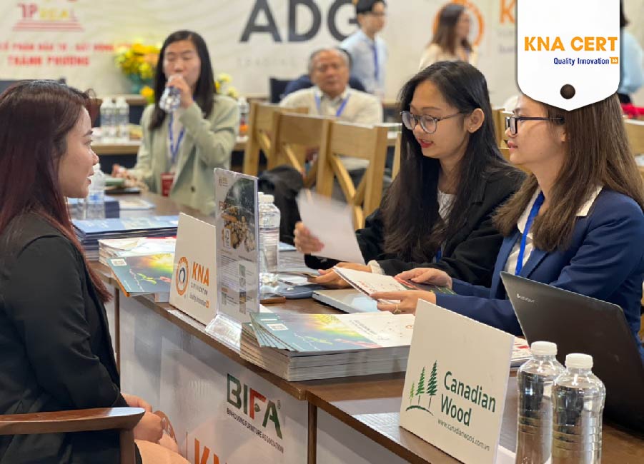 Sang ngày thứ hai, Ngày 23/02/2023, có nhiều khách hàng ghé thăm gian hàng của KNA Cert. Mỗi khách hàng đến với KNA đều được chuyên viên tư vấn của KNA tiếp đón và giải đáp các thắc mắc xung quanh những tiêu chuẩn dành riêng cho ngành xuất khẩu gỗ như FSC/COC (Tiêu chuẩn Chuỗi hành trình sản phẩm gỗ) và ENplus (Tiêu chuẩn viên nén gỗ)