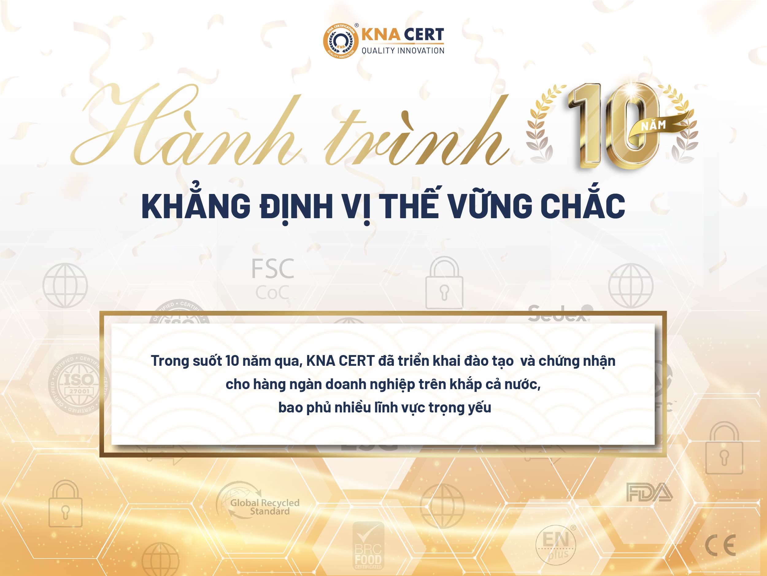 10 năm là chặng đường bền bỉ, nơi KNA CERT không ngừng nỗ lực để mang đến cho doanh nghiệp Việt và doanh nghiệp Quốc tế dịch vụ chứng nhận đáng tin cậy – chuyên nghiệp – chuẩn quốc tế, góp phần nâng cao năng lực cạnh tranh và hội nhập toàn cầu.