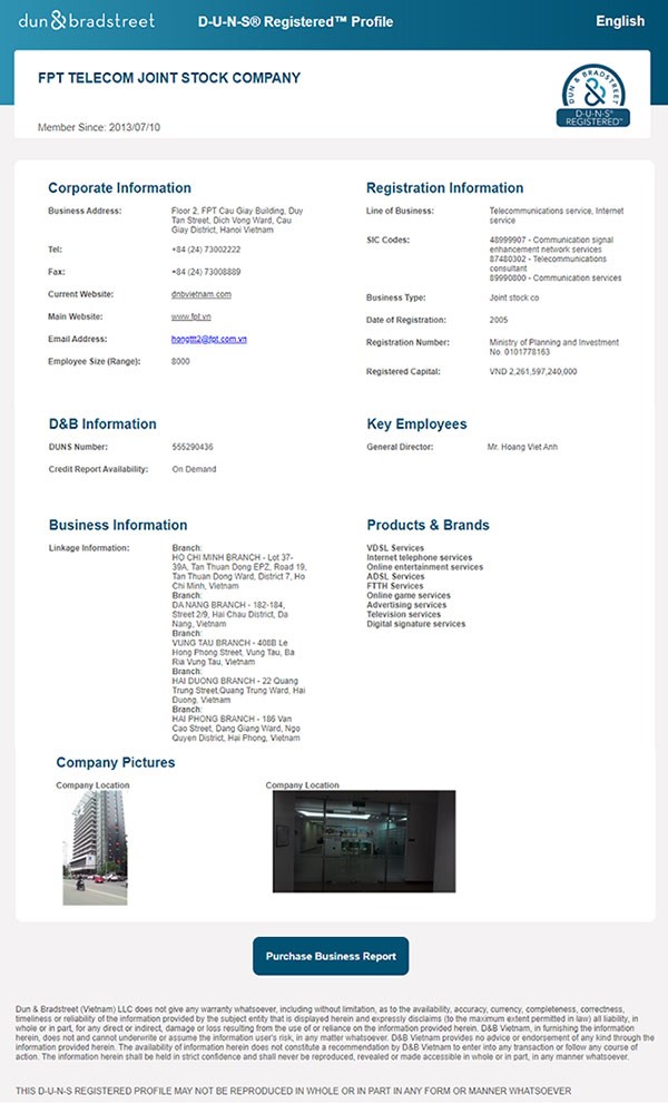 - Con dấu D-U-N-S® Registered™: Con dấu được hiển thị trên website công ty nhằm chứng minh độ tin cậy và tín nhiệm cao của doanh nghiệp