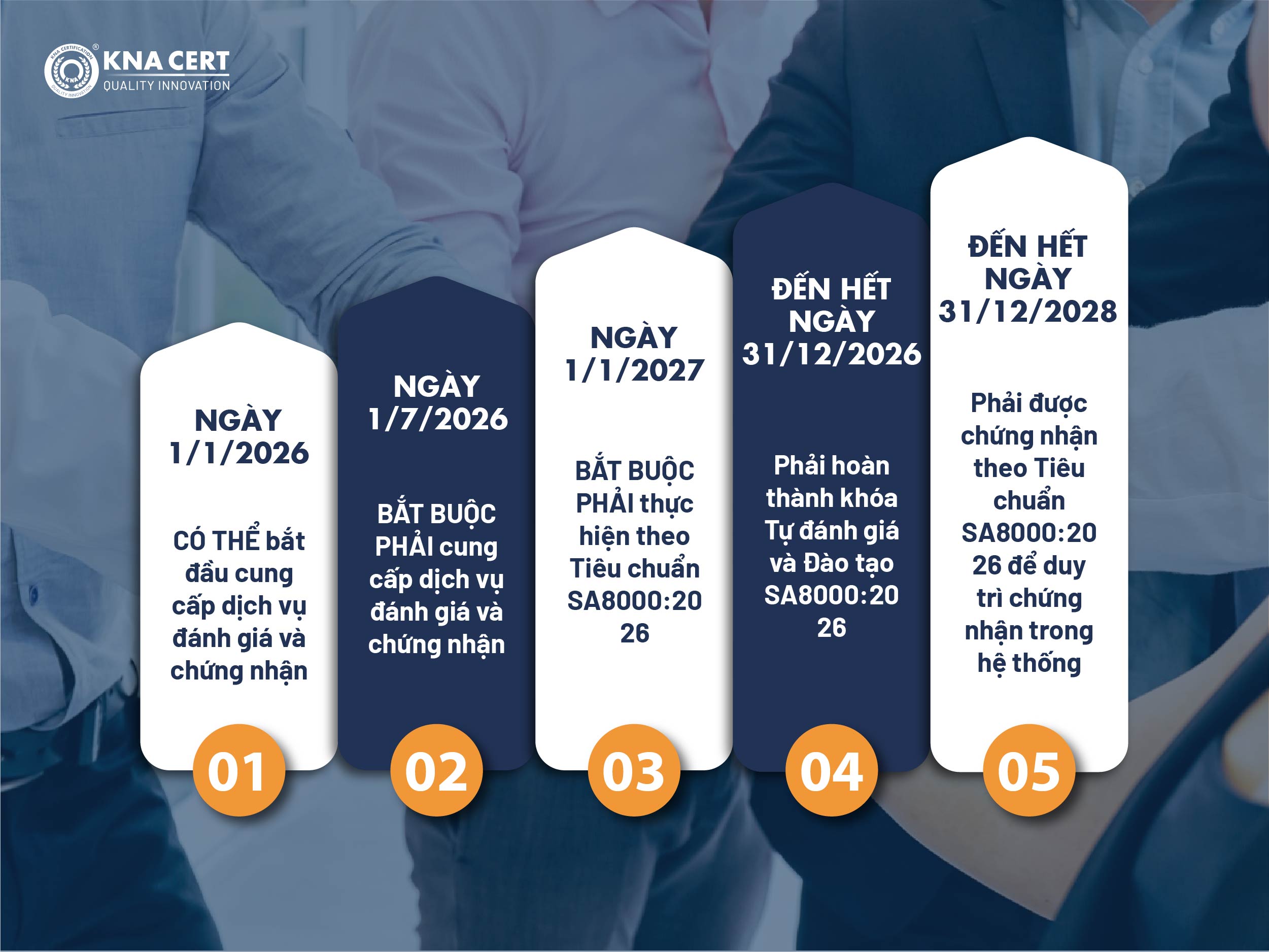 - Đến hết ngày 31/12/2026: Các tổ chức được chứng nhận theo SA8000:2014 phải hoàn thành khóa Tự đánh giá và Đào tạo SA8000:2026.