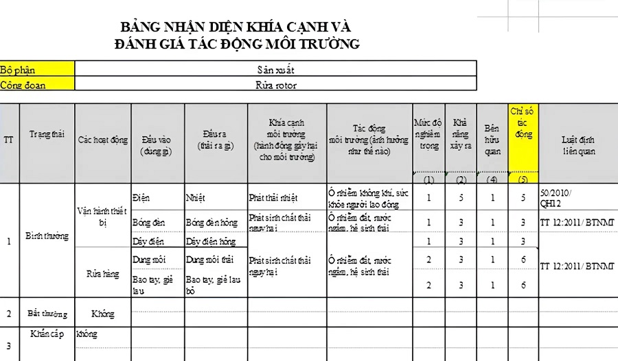 Dưới đây là ví dụ về mẫu đánh giá khía cạnh môi trường: