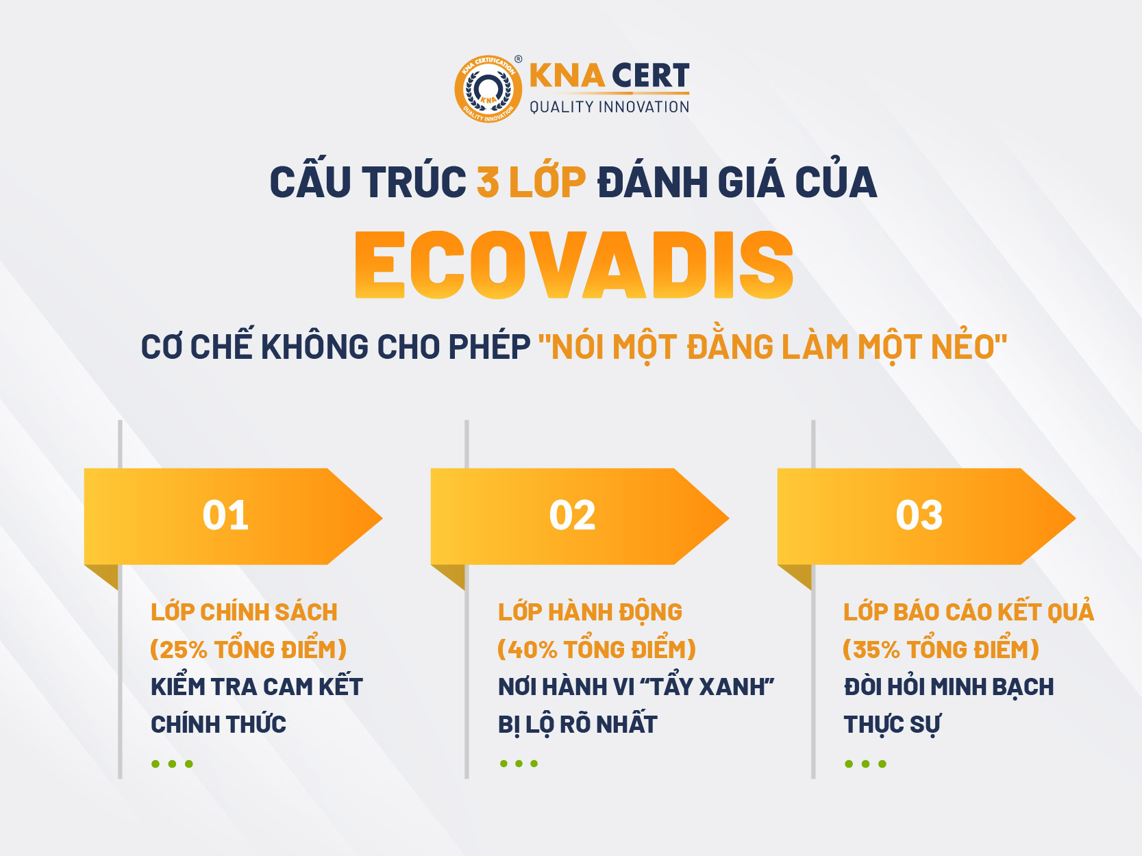 Hệ thống tính điểm EcoVadis được thiết kế theo cấu trúc 3 lớp chặt chẽ, mỗi lớp đánh giá một khía cạnh khác nhau của cam kết bền vững. Chính cấu trúc này ngăn chặn hiệu quả các hình thức Greenwashing tinh vi nhất.