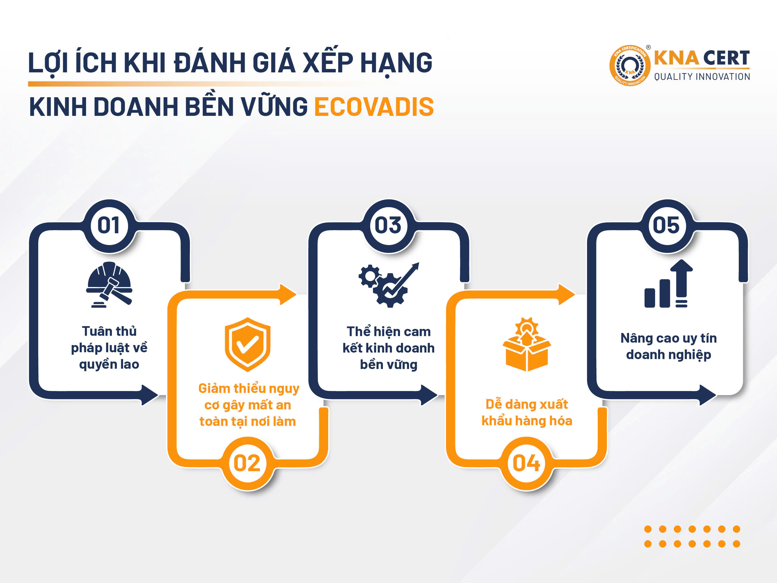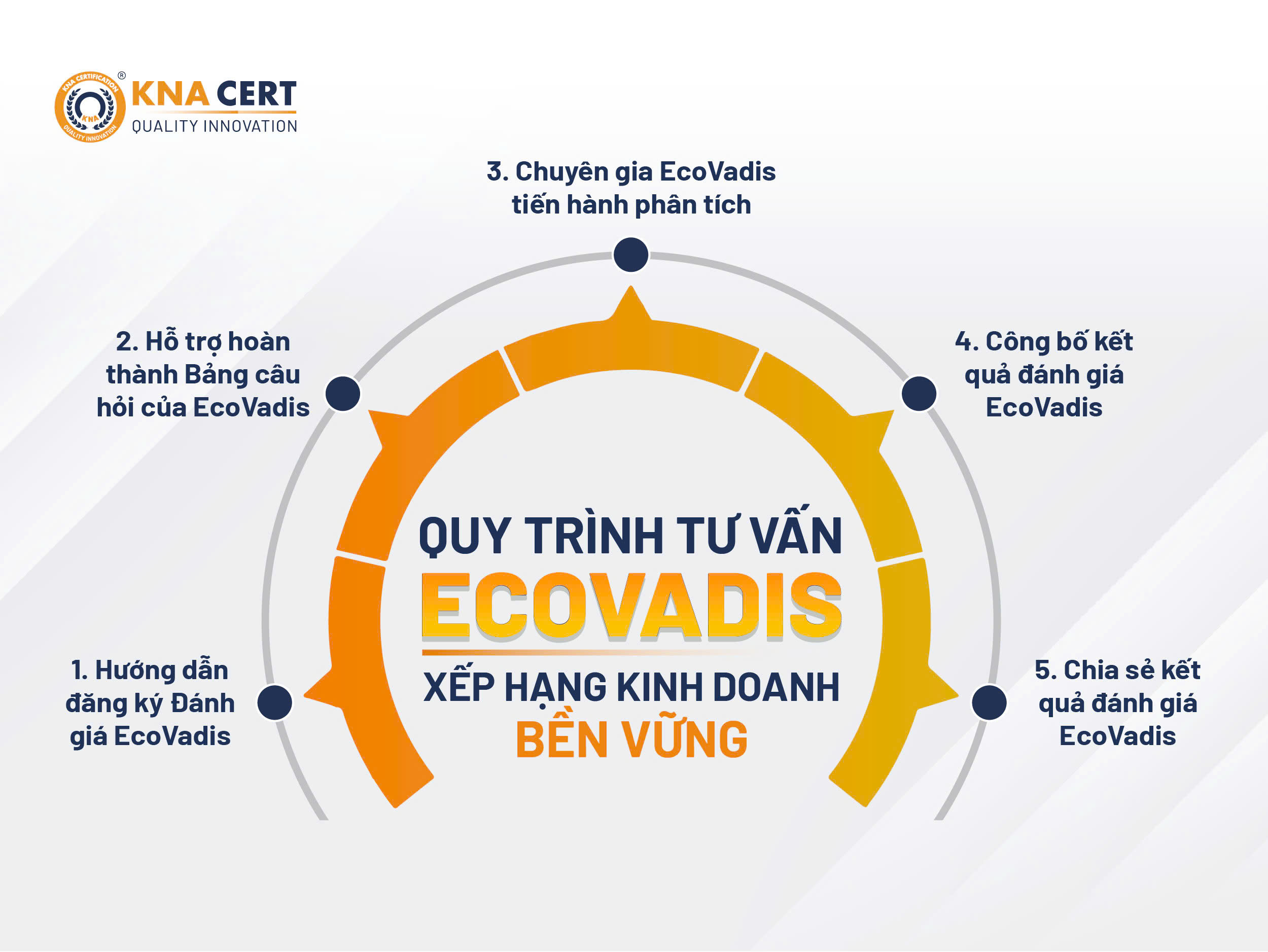 Với tư cách là một trong những tổ chức hỗ trợ doanh nghiệp hàng đầu tại Việt Nam, cùng phương châm: “Cùng Doanh Nghiệp vươn tầm Quốc Tế - Nâng vị thế Thương Hiệu Quốc Gia”, KNA tự hào đã giúp hàng nghìn doanh nghiệp hoàn thành các chương trình đánh giá CSR, trong đó có Xếp hạng Kinh doanh Bền vững EcoVadis.