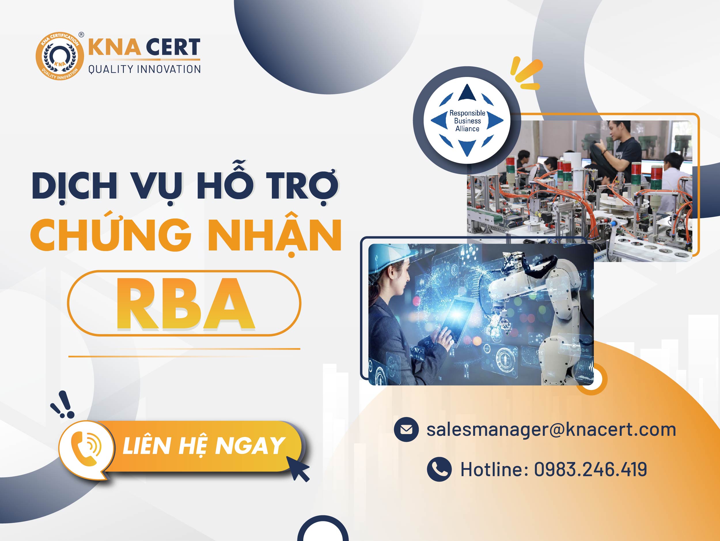 - Tuân thủ tiêu chuẩn RBA: KNA CERT giúp doanh nghiệp giải đáp mọi khó khăn, tháo gỡ mọi vướng mắc trong quá trình tuân thủ Tiêu chuẩn RBA, giúp doanh nghiệp hoàn thành Chứng nhận RBA và được cấp Chứng chỉ RBA với thứ hạng cao.